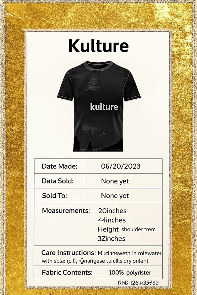 - Date Made & Date Sold  - Buyer Registry  - Measurements & Fabric Composition  - Care Instructions  - RN# Registration  - Optional Gold Leaf & Seam Thread Border  - Holographic Visuals for Signature Drops